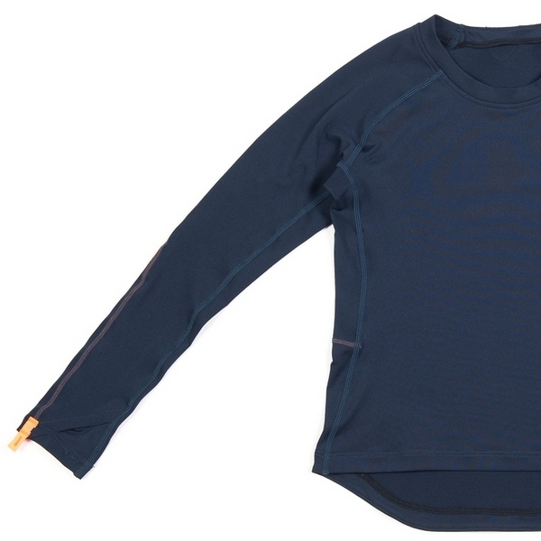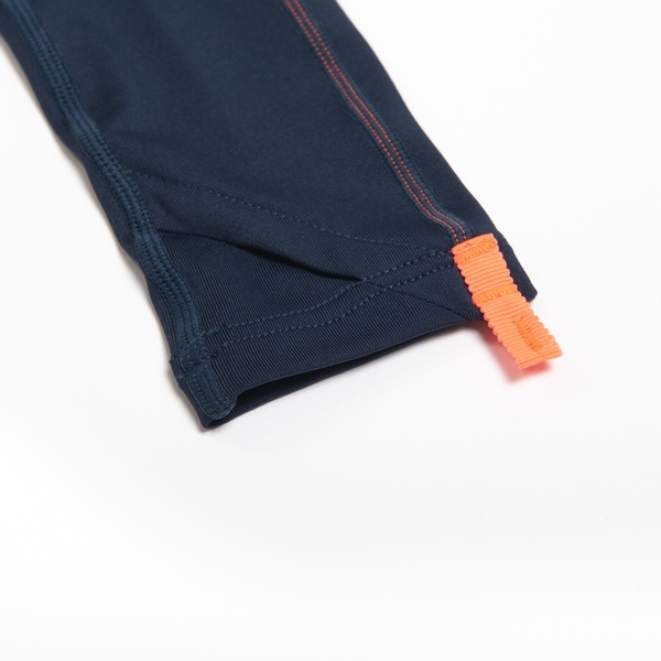 袖口設計有拇指洞口,長袖可包覆至手背。織帶的設計讓穿著較合身時,方便有施力點拉著穿脫。