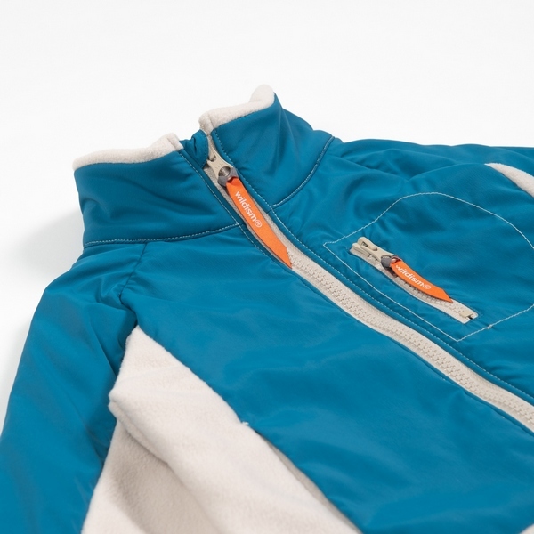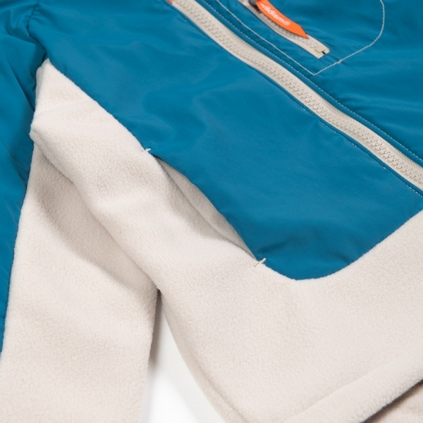 設計以搖粒絨為主體,針對前胸防風、肩部耐磨防潑水、肘部耐磨的需求,添加了具有耐磨、防風、防潑水功能的尼龍布料,使得搖粒絨夾克的功能得以更全面。