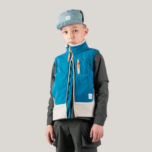 設計以搖粒絨為主體,針對前胸防風、肩部耐磨防潑水需求,添加了具有耐磨、防風、防潑水功能的尼龍布料,使得搖粒絨背心的功能得以更全面。